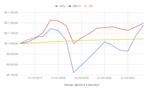 Agora, a nossa estratégia, além de cair menos e se recuperar mais rápido, alcança uma valorização muito acima dos outros dois.